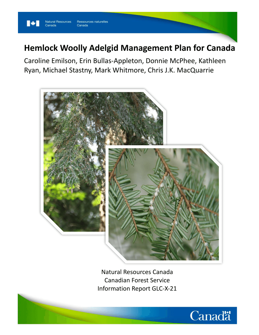 The hemlock woolly adelgid (HWA) is an aphid-like invasive pest from Asia that threatens hemlock survival in the eastern United States and more recently in eastern Canada. Hemlock is an important tree species because it is slow-growing and long-lived, with large canopies that create unique habitat that many plants and animals rely on. Hemlock are also very important to recreationalist and homeowners who enjoy and admire the unique environment that hemlock provide. The aim of this report is to outline the components for a HWA management plan in all eastern provinces that have hemlock at risk to HWA (i.e. Ontario, Quebec, New Brunswick, Nova Scotia, and Prince Edward Island). First, we summarize the risks and potential impacts associated with HWA in eastern Canada. We then outline potential components of an HWA management plan in Canada by summarizing the research and management tactics already explored and implemented in the eastern United States.