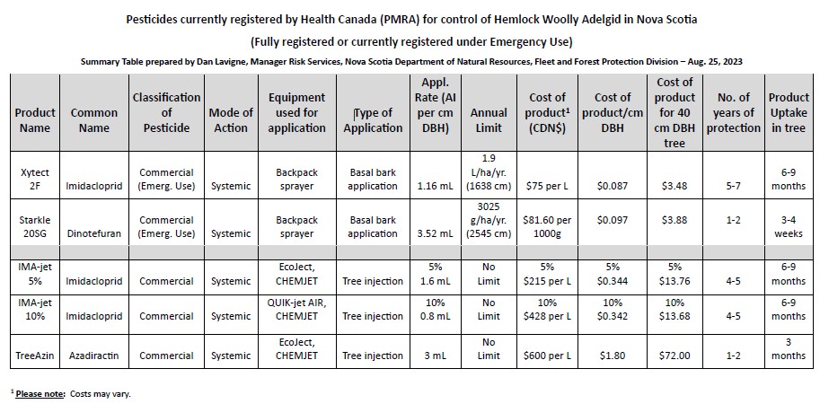 Insecticidal soaps and horticultural oils have been used instead of insecticides. They have a low toxicity and have been effective when properly applied. Multiple applications are required and thorough coverage on larger trees is extremely difficult. Horticultural oils function by suffocating the adelgid; infested needles and well-protected waxy ovisacs must be completely drenched. Traditional pyrethroids (an organic compound found in the majority of household insecticides) and other pesticides are considered less effective than systemic insecticides because of the difficulty in achieving adequate coverage and the larger amounts required for external spray applications, greatly increasing the toxicity exposure to other organisms. Other less toxic insecticides are also being tested by the Canadian Forest Service. Please carefully consider the options available and consult with a professional certified pesticide operator if you decide to use neonicotinoids to help keep hemlock alive and mitigate the spread of HWA on your property.